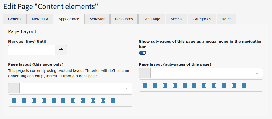 - Search page: to show the search box in the header if the extension Indexed search is installed, by setting the page that contains the search results