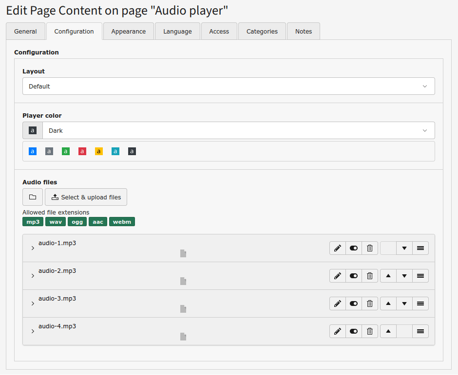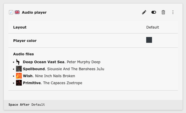 The Audio player content element allows to show and audio player with as many audio files as desired.