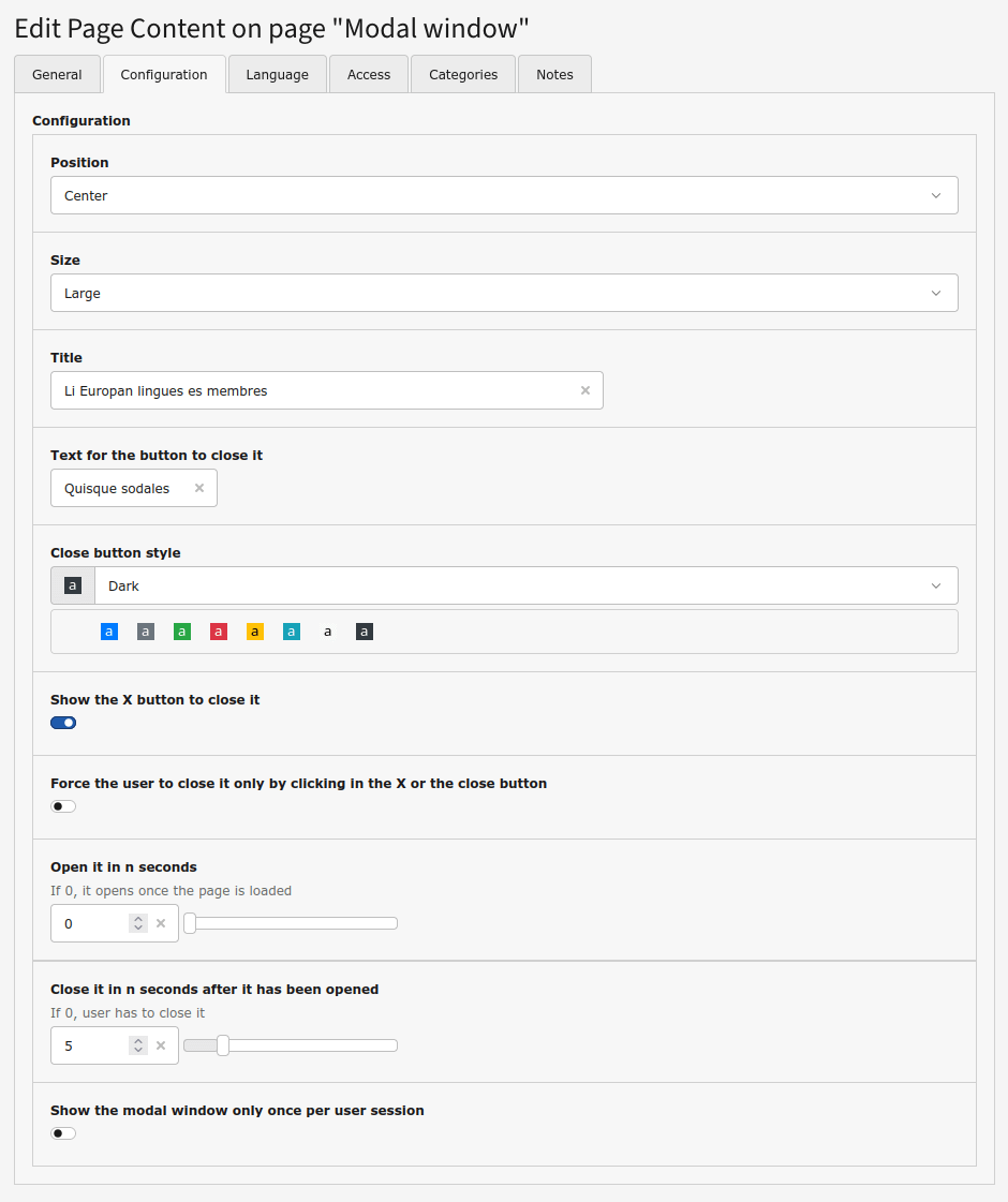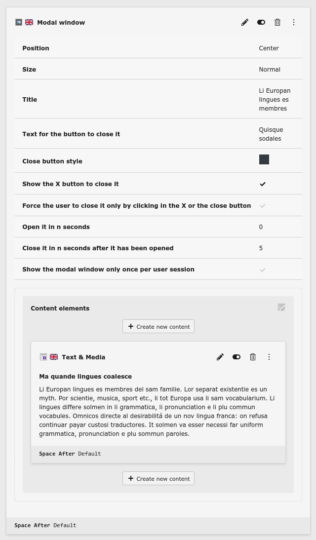 The Modal window content element allows to add a dialog in a lightbox window, which can be shown on each page load or once per session. It can contain any type of content element. It's possible to set its size and position and when it has to be opened and closed.