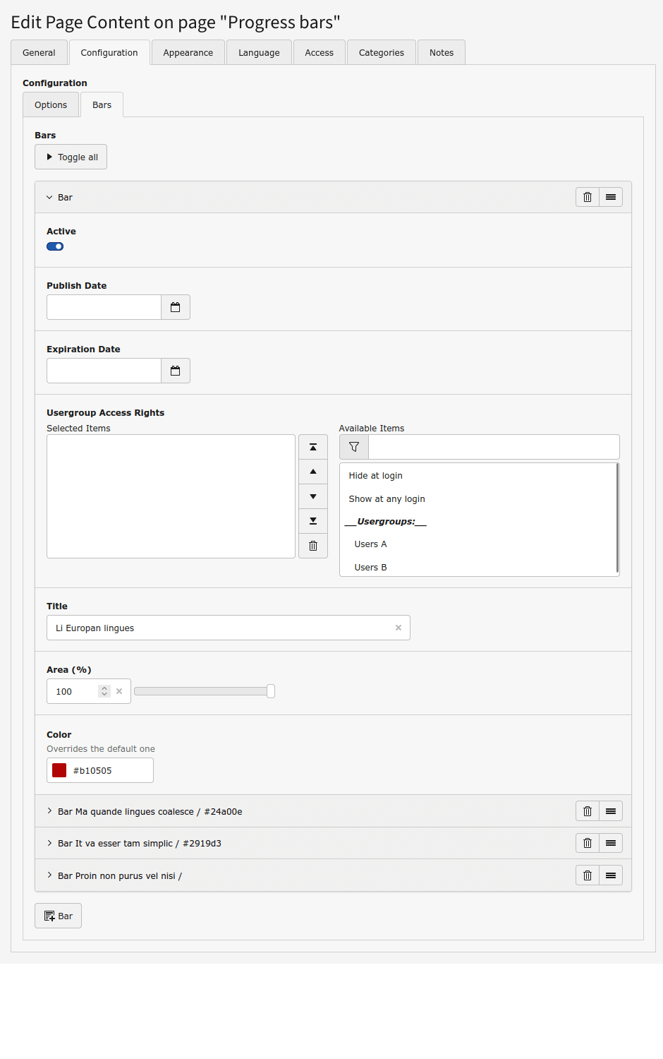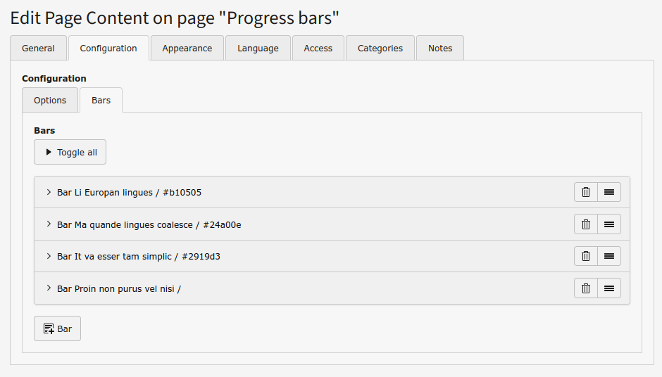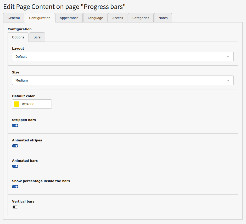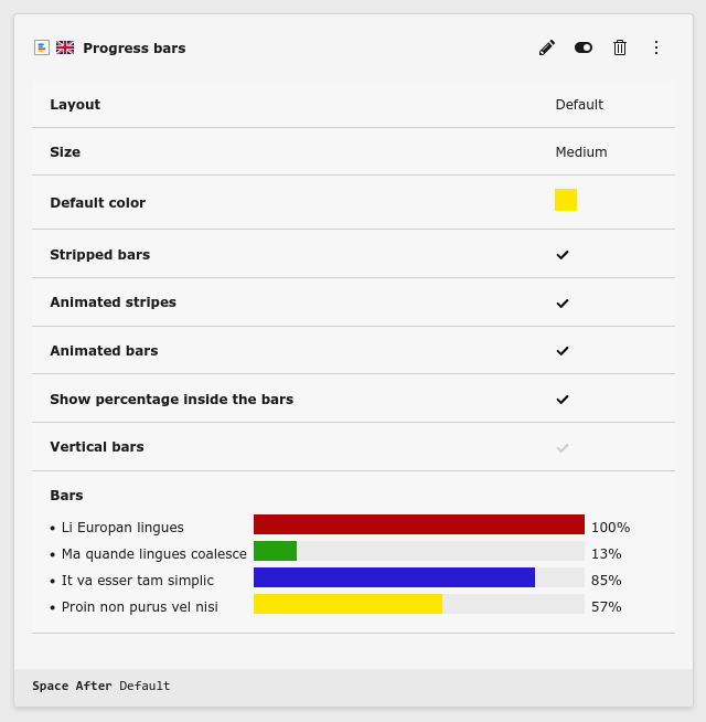 The Progress bars content element allows to show bars (horizontal or vertical) to indicate the progress of tasks.