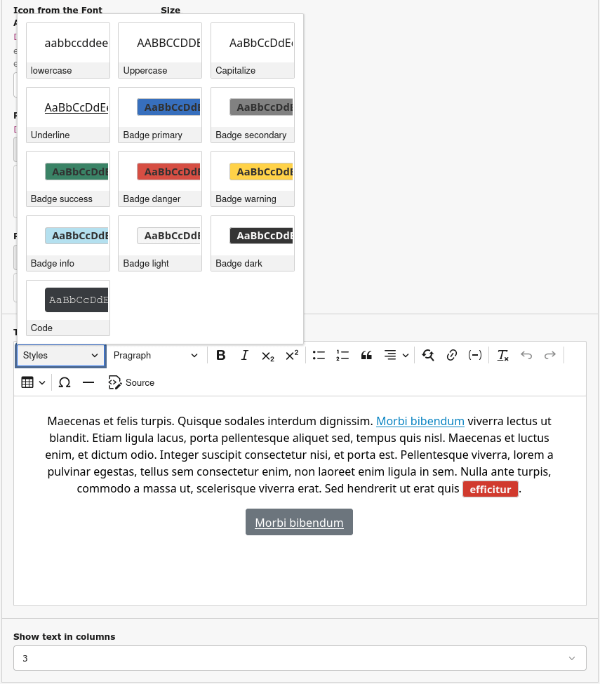 The RTE is customized so Bootstrap classes can be applied to text, links, buttons, badges, and tables.